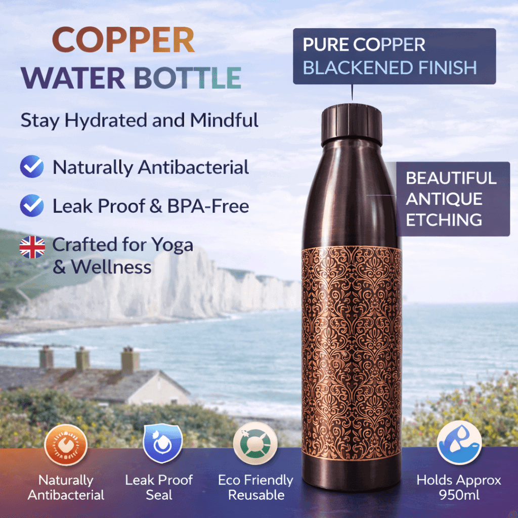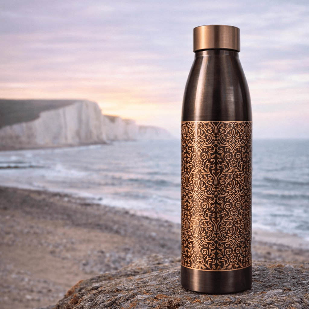 Made from pure copper, the bottle features a detailed antique style etched pattern that gives it a premium and timeless look. The smooth shape makes it comfortable to hold, while the clean screw cap ensures a tight seal for safe daily use.